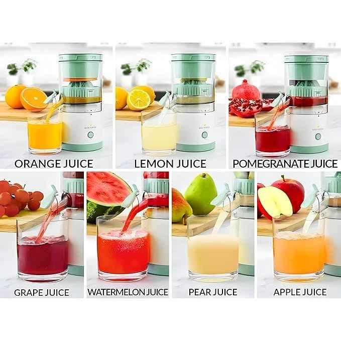Portable electric citrus squeezer with 80W motor for quick juice extraction. Features 360-degree rotating design for maximum juice yield from lemons, oranges, limes, and other citrus fruits.